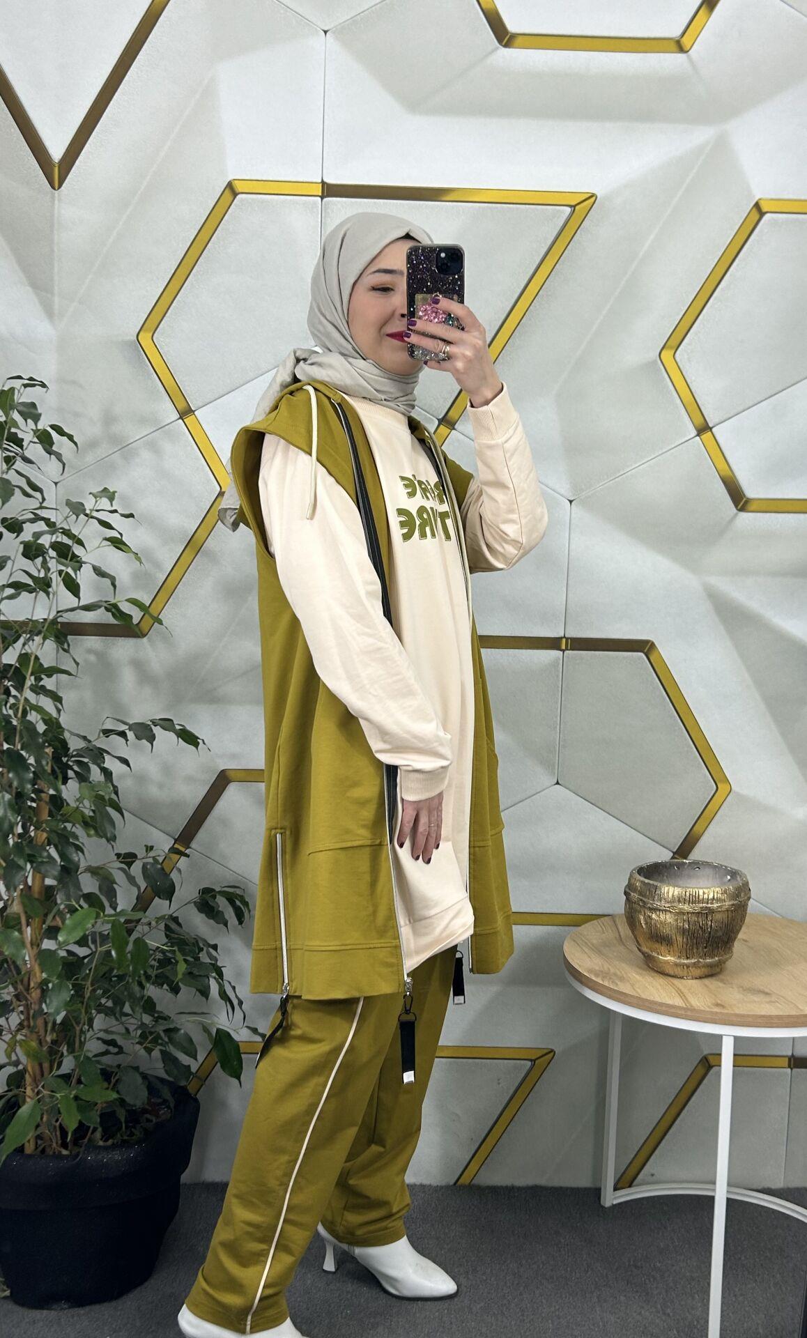 Yağ Yeşili Tesettür Yelek Pantolon Takım